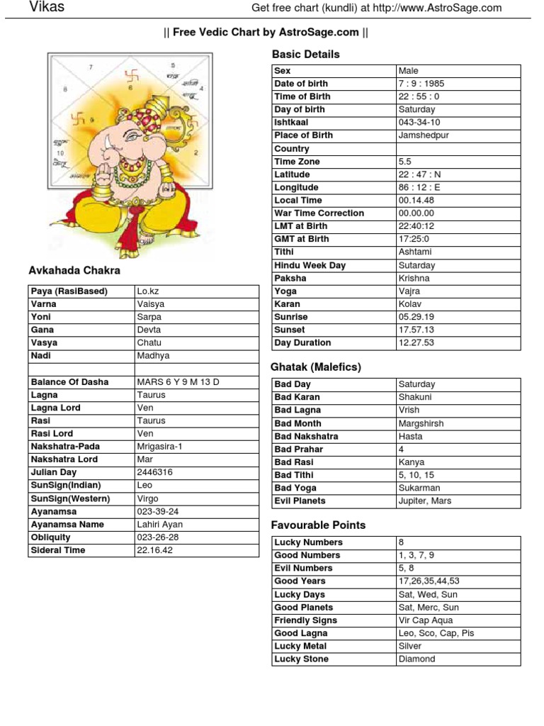 Powerful Lakshmi Mantra and Mahalaskhmi Mantra for Wealth ... - Vedic … Get your free personalised astrology life report now. Join over 5 lakh + Vedic Rishi members . Access Now. Note: * This report is free for a limited period of time. Offers ends in : MENU. Kundli. Kundli in Hindi (कुंडली) Kundli Matching. Vedic Store. Horoscope. Panchang. Hora Muhurta. Chaughadiya Muhurta. Premium Kundli PDF. What is Astrology. Remedial Astrology. … Hora Astrology · Hora Vedic Astrology by Steve for Birth ... Hora as per Vedic Astrology is based on the sequence of the week days, namely Sunday, Monday, Tuesday etc. One may ask, whether there is a scientific reason for this above sequence. Yes it is there, as below. The planets are listed below according to their orbital period around Earth. Saturn 29 years Jupiter 12 years Mars 687 days Birth Chart · Hora Vedic Astrology by Steve for Birth ... Read a horoscope as per vedic astrology as follows Ascertain Lagna or ascendant and its lord, Chandra and Surya sign lord. With the above one can ascertain the personality of the person, by applying the gunas of ascendant, its lord,grahas in lagna. Gunas of Chandra sign, its lord and grahas, to be read, for the person's mind and emotions.