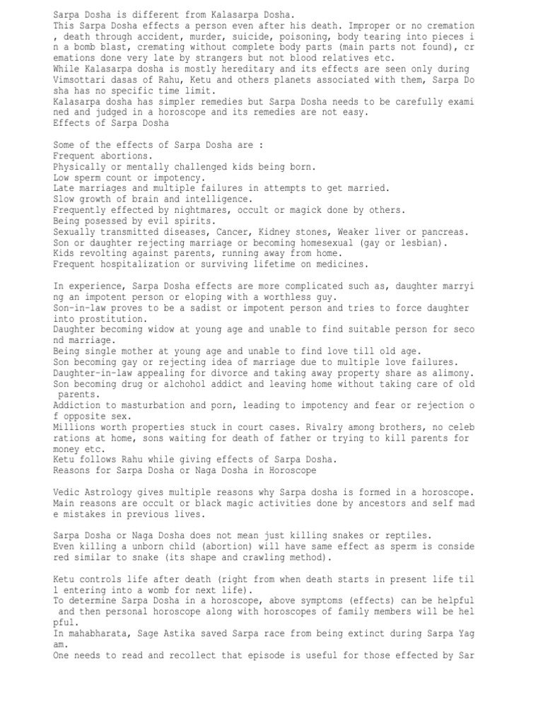 What is KaalSarpa Yoga |kalasarpa dosha in Vedic Astrology From Ketu to Rahu all the houses are filled, it is called Apasavya Kala Sarpa Dosham. In Astrological science, Rahu is termed as the Head and Ketu is termed as tail of Sarpa. The Vedic pundits terms that the Kalasarpa yogam is most dangerous one in ones life span. KaalSarpa Yoga |kalasarpa dosha and effects in Marriage - Vedic Astrology The effects of Kala Sarpa Dosha and marriage Every action has an equal and opposite reaction. This law is not just confined to a life in one birth but the pious credit (Punniyam) and debit (Paavam) carried over from previous birth plays a role in all the 7 births in one form or another. Why do you think life is unfair most of the time? What is kaalsarp dosha in astrology? What are it's consequences ... - Quora Kala Sarpa Dosha in Vedic Astrology, is resulted in a native's birth chart (Janma Kundali) when all the 7 planets of Vedic Astrology viz., Sun, Moon, Mars, Mercury, Jupiter, Venus and Saturn are located towards only one side of the chart (i.e., in a span of 180 degrees or less and are all placed between Rahu and Ketu in the natal chart. vedas - KalaSarpa Dosha - A Myth or Reality in Astrology? - Hinduism ... Kala Sarpa Yoga is formed when all the planets lie on one side of the nodal axis (Rahu-Ketu axis) in the horoscope. However, classical Hindu astrological treatise such as Brihat Parasara Hora Shastra, Phaladeepika, Jataka Parijata, Uttara Kalamrita etc., did not mention this yoga (Kala Sarpa Ch. 1. Absence of references in Shastra; p16-21).