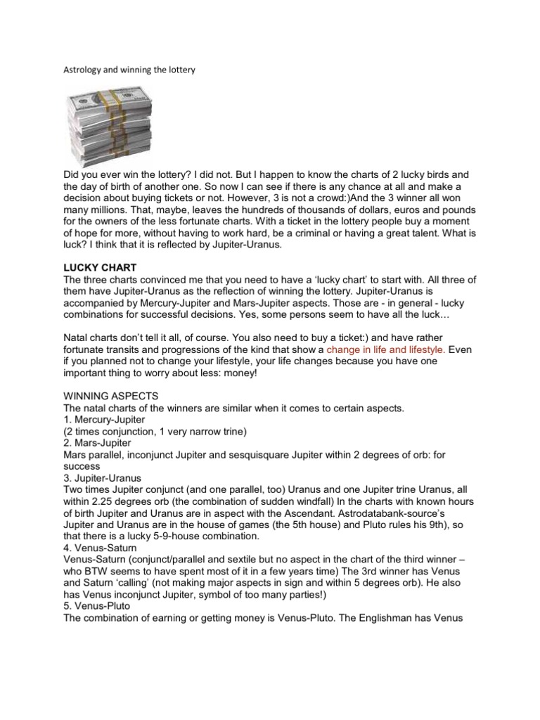 Using Astrology with Lotteries - Lucky Days 1. By indicating when you have very little chance of winning anything, let alone a lottery. An analysis of many dozens of lucky days shows that most wins occur under favorable planetary transits, when there are no adverse transits from Mercury, Venus and Mars, and sometimes the Sun and Saturn. The Most Accurate Lottery Horoscope from Lottery Pros Hence, gambling and playing the lottery religiously are both common for this horoscope. If a Leo wins, they'll probably enjoy some luxuries while also sharing a large portion of the prize with loved ones. Using Astrology to Win the Lottery Astrology is a very powerful tool as it is based on faith. Winning the lottery is primarily based on having a positive attitude and believing that you can win against the odds. In Astronomy, there are times believed to increase the chances of success in areas of life. Astrology Transits and Lottery Wins | Lipstick Alley Lottery wins are usually attributed to the 2nd, 5th, 8th, and 11th houses, the planets in these houses, and their rulers.The 2nd house represents wealth and material possessions; the fifth house represents the lottery and gambling; the 8th house represents unearned money and other people s money; the 11th house rules accumulated wealth and fluctuating money gains.