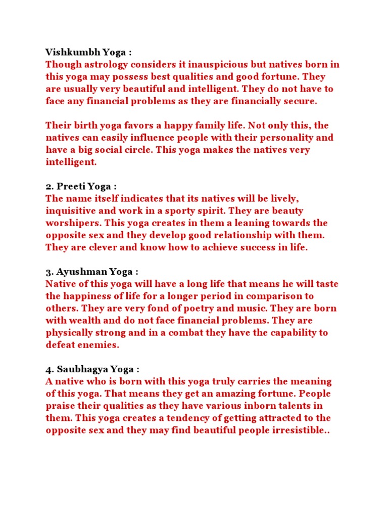 Auspicious Yoga Calculator Astrology - Meaning & Benefits Any Yoga in a birth chart or Kundali comes from various celestial combinations and is a result of a person's past lives. Yogas in a horoscope cannot be changed and are pretty dual, meaning Yogas can be good or bad. Yogas give results based on the Karma of the present life, and an individual can alleviate the unfavourable effects of Yoga.