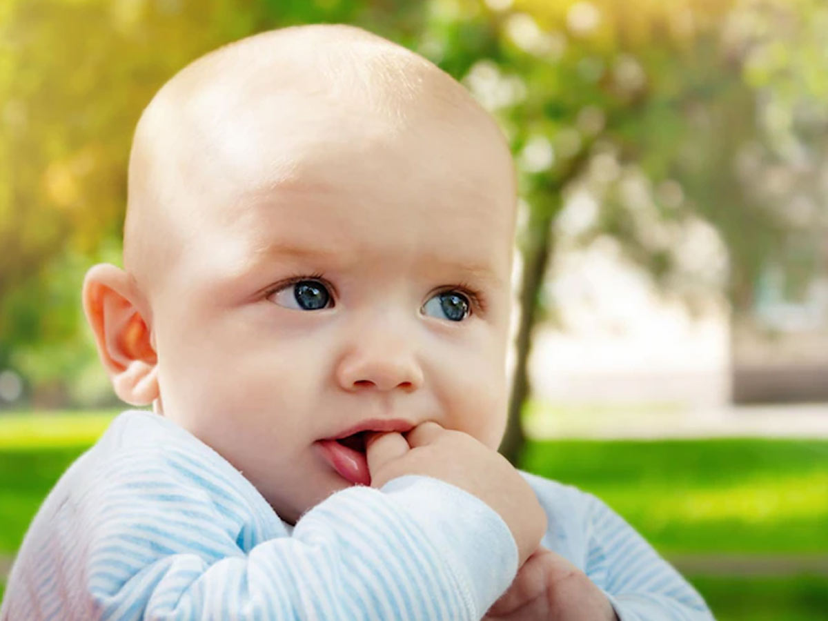 How to take care of a Newborn baby ? - Hinduism for Kids The baby teeth to erupt first are the lower central incisors. They erupt between 5 to 9 months of age. This is followed by the eruption of upper central incisors, first molars, canines, second molars in order at an interval of 1 to 3 months each. The second molars usually erupt between 20 to 30 months of age.